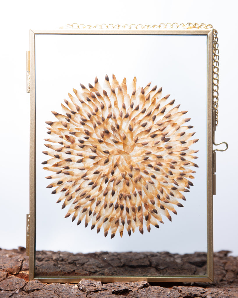 Onder de schubben van de dennenappels zitten vliezen met zaad deze zijn gedroogd en daarna in een mooie lijst gedecoreerd. Dit winterse lijstje is een uniek natuurproduct en kan qua vorm en kleur iets afwijken als op de foto dat maakt het juist zo bijzonder.