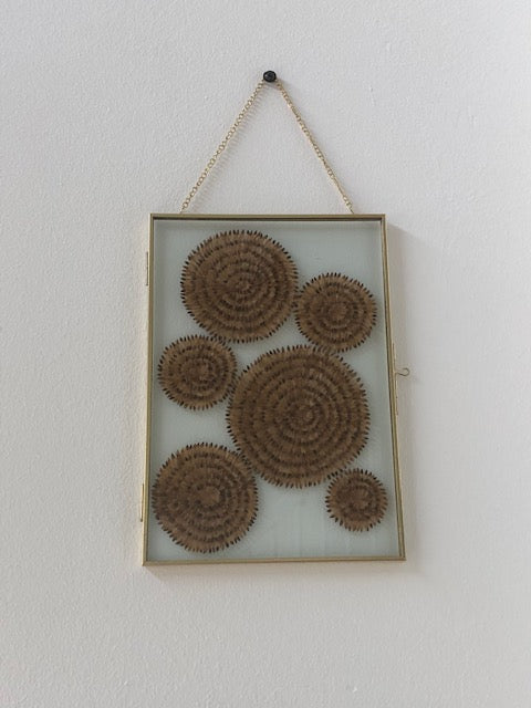 Onder de schubben van de dennenappels zitten vliezen met zaad deze zijn gedroogd en daarna in een mooie lijst gedecoreerd. Dit winterse lijstje is een uniek natuurproduct en kan qua vorm en kleur iets afwijken als op de foto dat maakt het juist zo bijzonder.